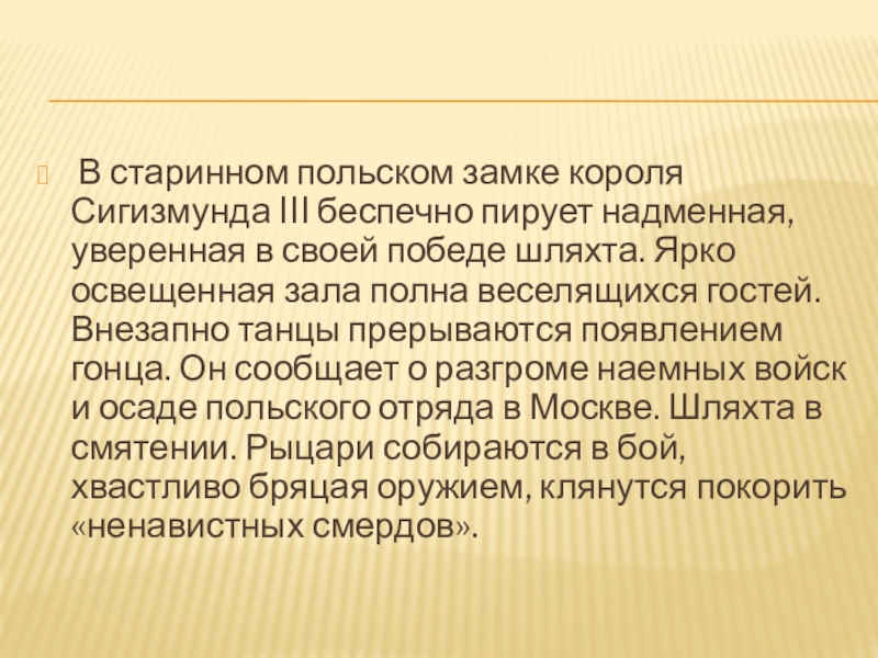 Слайд 9 В старинном польском замке короля Сигизмунда III беспечно пирует надменная, уверенная в своей