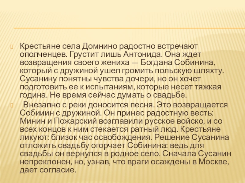 Слайд 6Крестьяне села Домнино радостно встречают ополченцев. Грустит лишь Антонида. Она ждет
