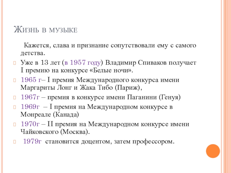 Уже в 13 лет (в 1957 году) Владимир Спиваков получает I премию на конкурсе «Белые ночи».