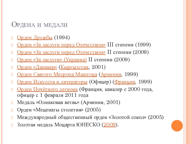 вклад музыканта в мировое искусство, его деятельность во имя мира и развитие диалога между культурами» (2006)