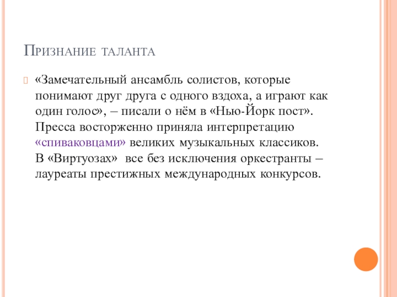 а играют как один голос», – писали о нём в «Нью-Йорк пост». Пресса восторженно приняла интерпретацию «спиваковцами» великих музыкальных классиков.