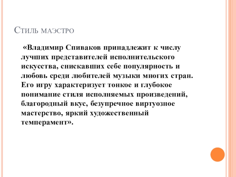 искусства, снискавших себе популярность и любовь среди любителей музыки многих стран. Его игру характеризует тонкое и глубокое понимание стиля исполняемых произведений, благородный вкус, безупречное виртуозное мастерство, яркий художественный темперамент».