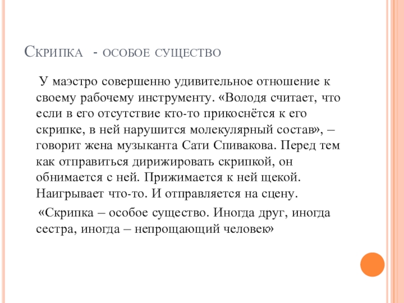 своему рабочему инструменту. «Володя считает, что если в его отсутствие кто-то прикоснётся к его скрипке, в ней нарушится молекулярный состав», – говорит жена музыканта Сати Спивакова. Перед тем как отправиться дирижировать скрипкой, он обнимается с ней. Прижимается к ней щекой. Наигрывает что-то. И отправляется на сцену.