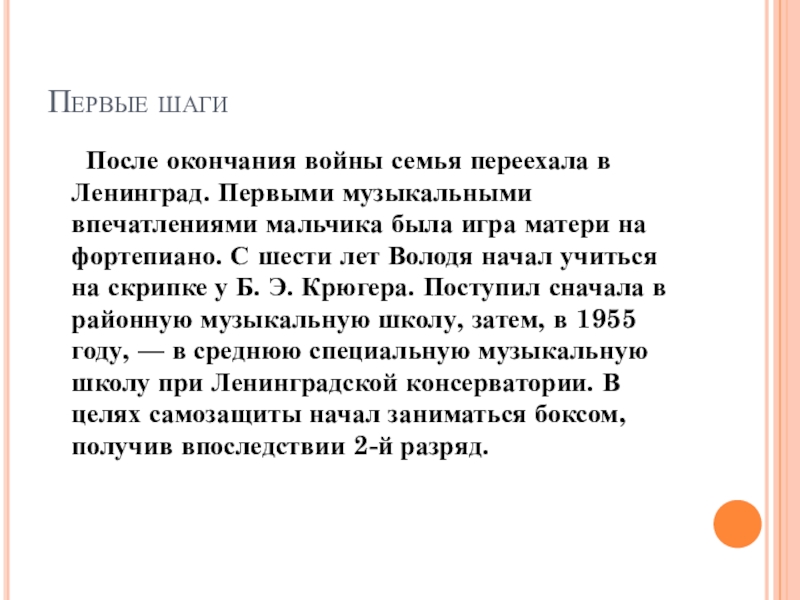 Первыми музыкальными впечатлениями мальчика была игра матери на фортепиано. С шести лет Володя начал учиться на скрипке у Б. Э. Крюгера. Поступил сначала в районную музыкальную школу, затем, в 1955 году, — в среднюю специальную музыкальную школу при Ленинградской консерватории. В целях самозащиты начал заниматься боксом, получив впоследствии 2-й разряд.