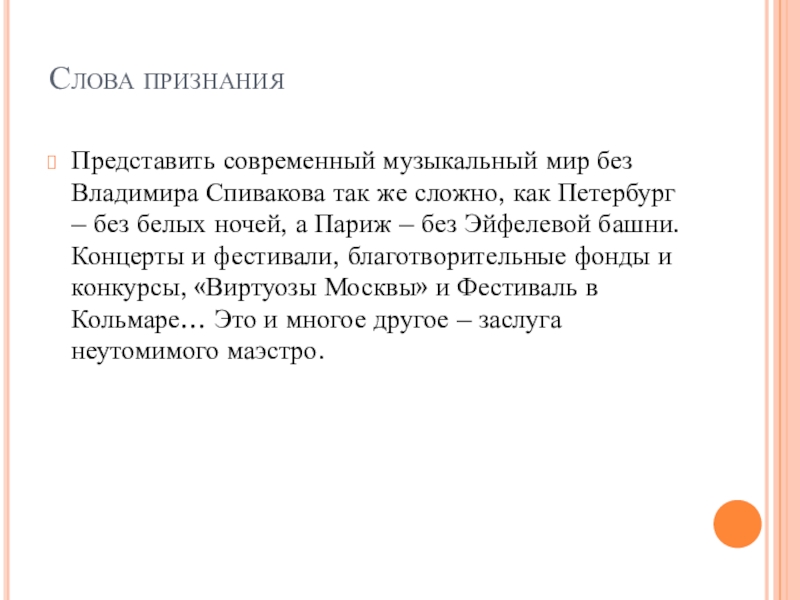 Представить современный музыкальный мир без Владимира Спивакова так же сложно,