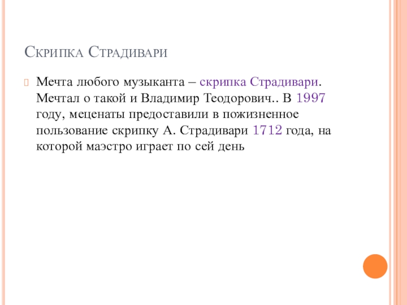 Владимир Теодорович.. В 1997 году, меценаты предоставили в пожизненное пользование скрипку А. Страдивари 1712 года, на которой маэстро играет по сей день