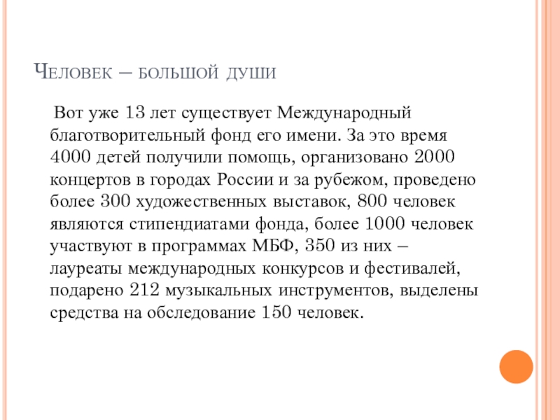 благотворительный фонд его имени. За это время 4000 детей получили помощь, организовано 2000 концертов в городах России и за рубежом, проведено более 300 художественных выставок, 800 человек являются стипендиатами фонда, более 1000 человек участвуют в программах МБФ, 350 из них – лауреаты международных конкурсов и фестивалей, подарено 212 музыкальных инструментов, выделены средства на обследование 150 человек.