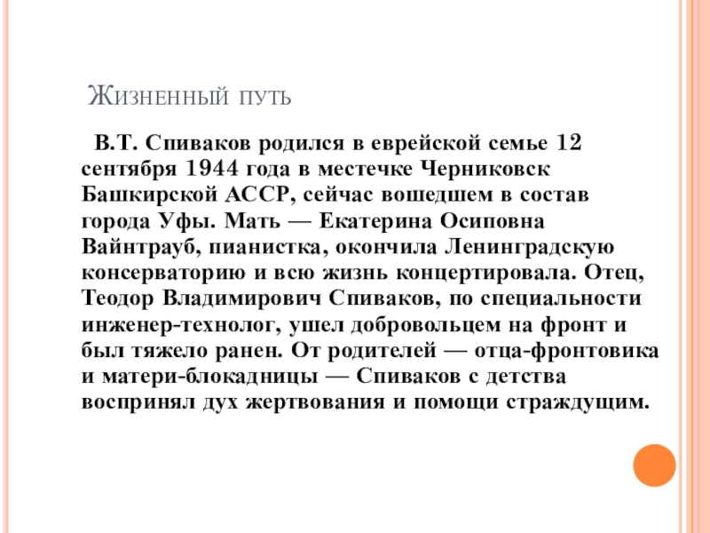 сентября 1944 года в местечке Черниковск Башкирской АССР, сейчас вошедшем в состав города Уфы. Мать — Екатерина Осиповна Вайнтрауб, пианистка, окончила Ленинградскую консерваторию и всю жизнь концертировала. Отец, Теодор Владимирович Спиваков, по специальности инженер-технолог, ушел добровольцем на фронт и был тяжело ранен. От родителей — отца-фронтовика и матери-блокадницы — Спиваков с детства воспринял дух жертвования и помощи страждущим.