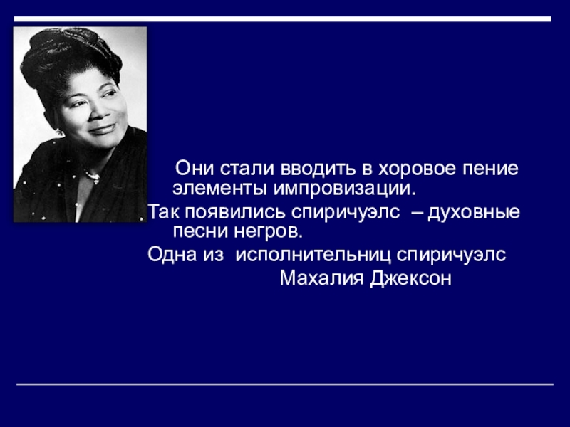 Духовные песни негров      Они стали вводить в хоровое пение элементы импровизации. Так