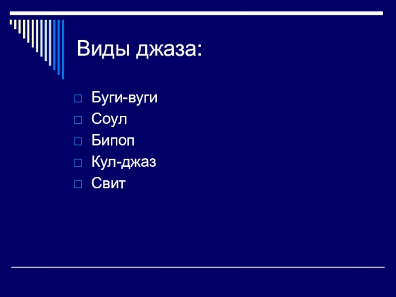 Виды джаза:Буги-вугиСоулБипопКул-джазСвит
