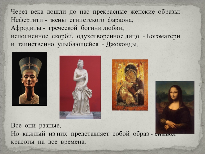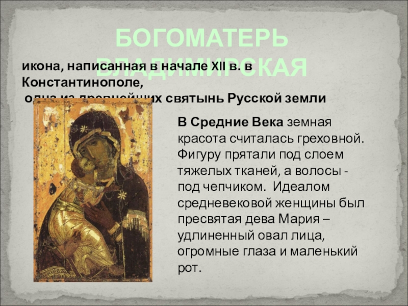 В Средние Века земная красота считалась греховной. Фигуру прятали под слоем тяжелых тканей, а волосы - под чепчиком. Идеалом средневековой женщины был пресвятая дева Мария – удлиненный овал лица, огромные глаза и маленький рот.
