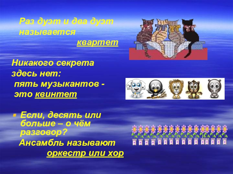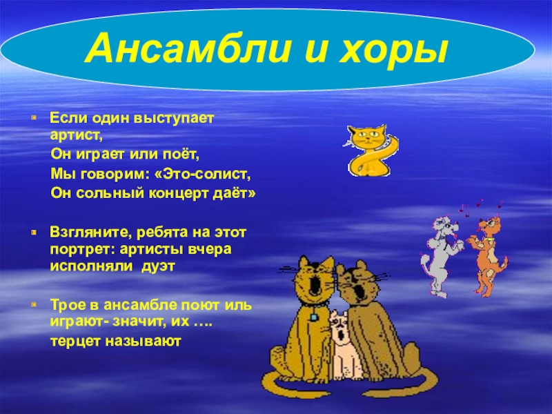 Ансамбли и хорыЕсли один выступает артист,   Он играет или поёт,   Мы говорим: «Это-солист,