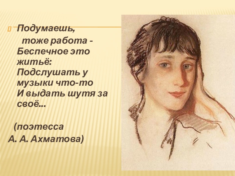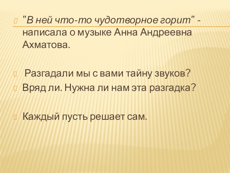 Слайд 14"В ней что-то чудотворное горит" - написала о музыке Анна Андреевна
