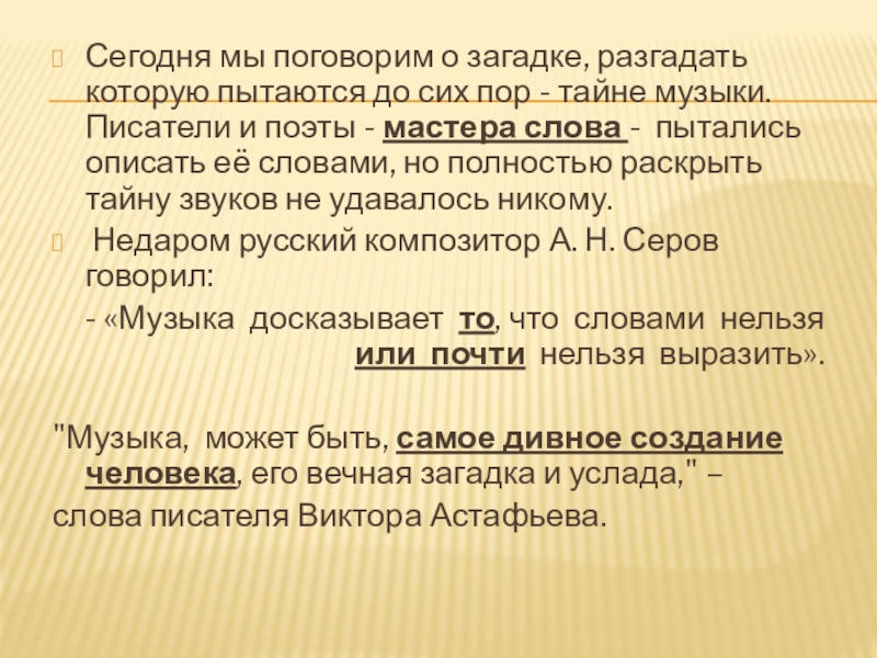 - «Музыка досказывает то, что словами нельзя или почти нельзя выразить».