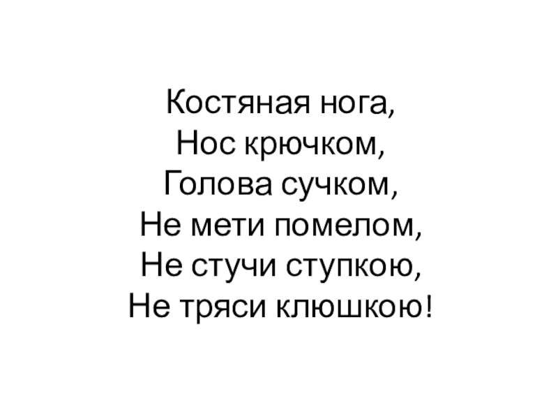 Слайд 2Костяная нога, Нос крючком, Голова сучком, Не мети помелом, Не стучи ступкою, Не тряси клюшкою!