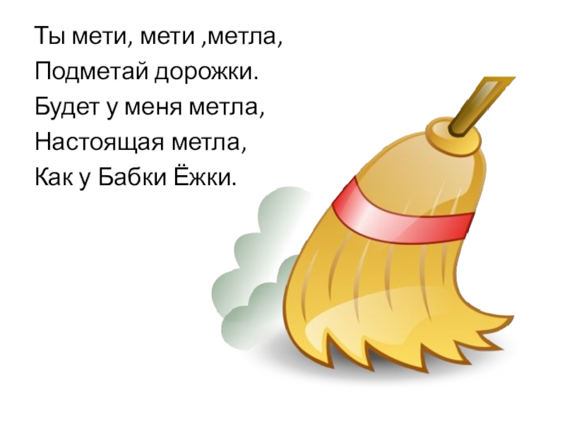 Ты мети, мети ,метла,Подметай дорожки.Будет у меня метла, Настоящая метла, Как у Бабки Ёжки.