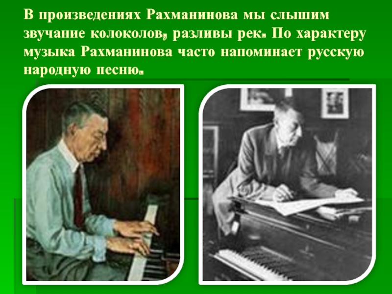В произведениях Рахманинова мы слышим звучание колоколов, разливы рек. По характеру музыка Рахманинова часто напоминает русскую народную