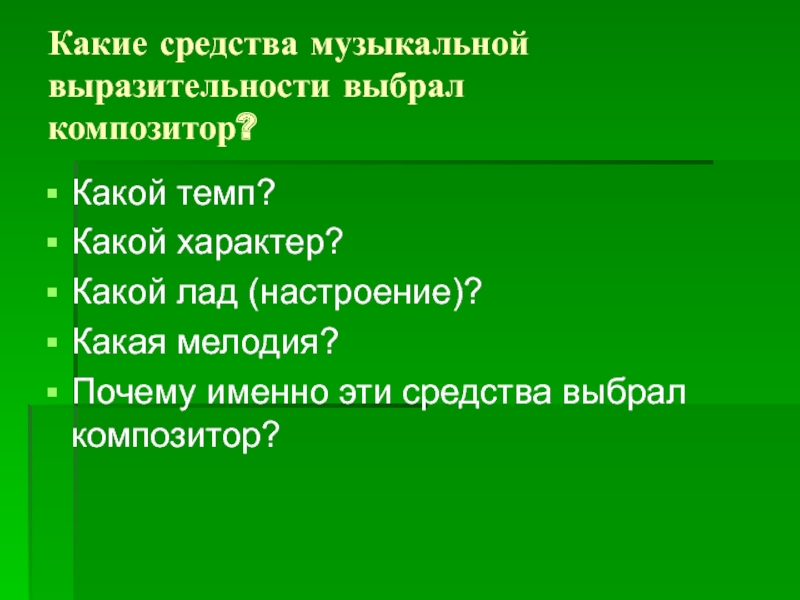 Какие средства музыкальной выразительности выбрал  композитор?Какой темп?Какой характер?Какой лад (настроение)?Какая мелодия?Почему именно эти средства выбрал композитор?