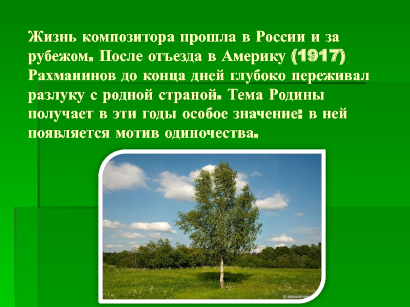 Америку (1917) Рахманинов до конца дней глубоко переживал разлуку с родной страной. Тема Родины получает в эти годы особое значение: в ней появляется мотив одиночества.