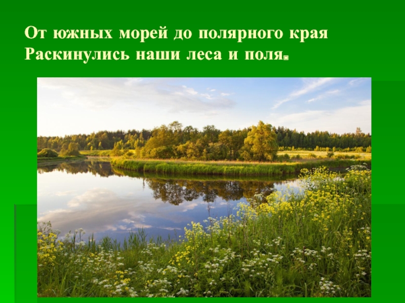 Слайд 2От южных морей до полярного края Раскинулись наши леса и поля.