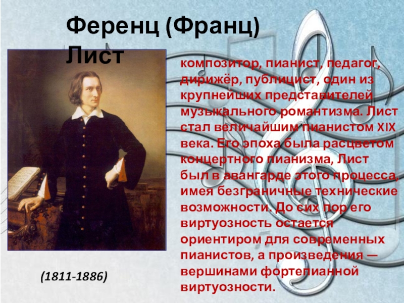 крупнейших представителей музыкального романтизма. Лист стал величайшим пианистом XIX века. Его эпоха была расцветом концертного пианизма, Лист был в авангарде этого процесса, имея безграничные технические возможности. До сих пор его виртуозность остается ориентиром для современных пианистов, а произведения — вершинами фортепианной виртуозности.
