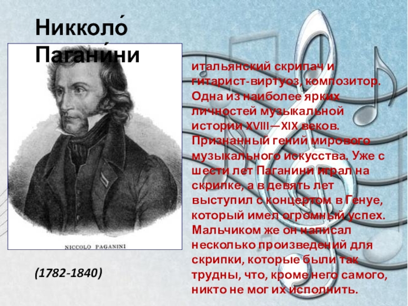 личностей музыкальной истории XVIII—XIX веков. Признанный гений мирового музыкального искусства. Уже с шести лет Паганини играл на скрипке, а в девять лет выступил с концертом в Генуе, который имел огромный успех. Мальчиком же он написал несколько произведений для скрипки, которые были так трудны, что, кроме него самого, никто не мог их исполнить.