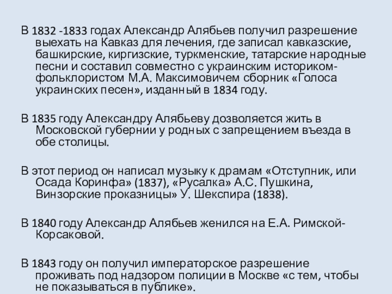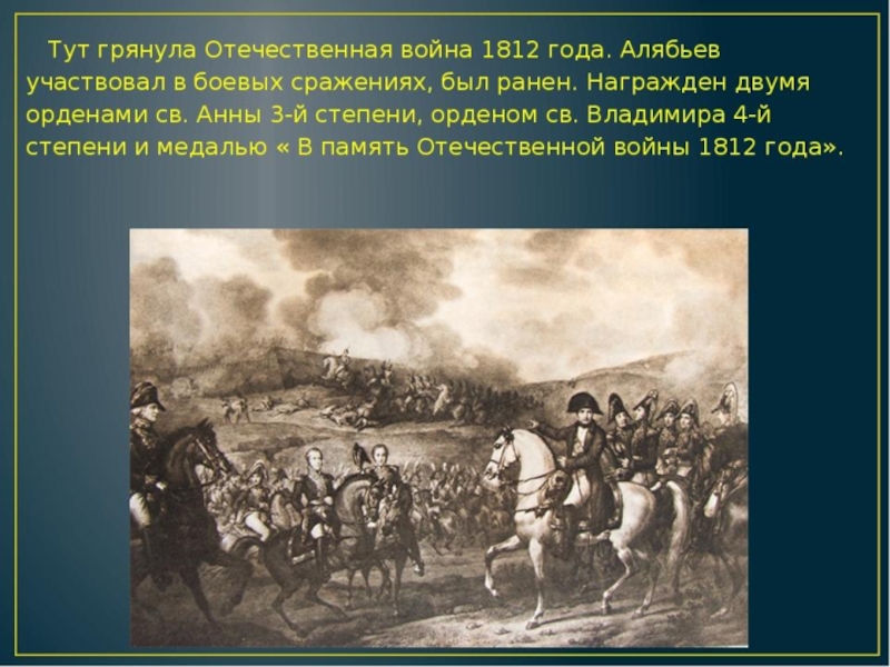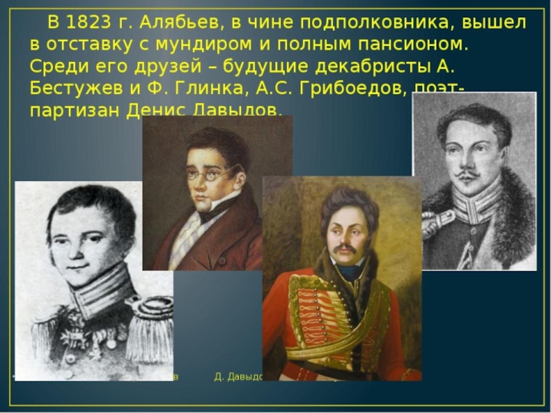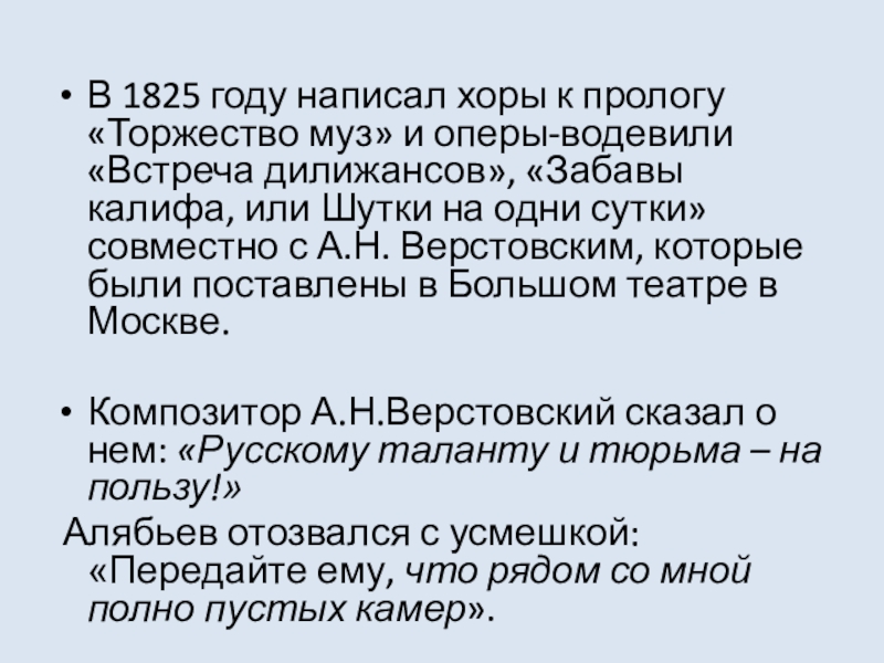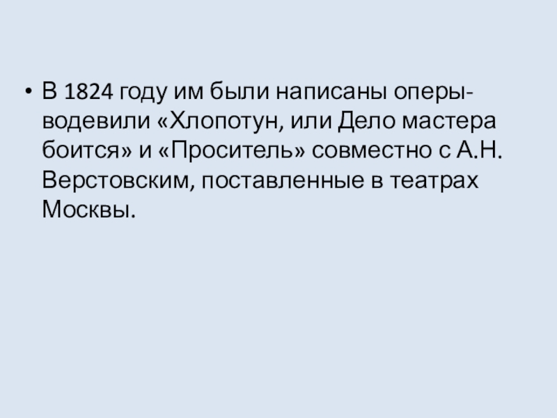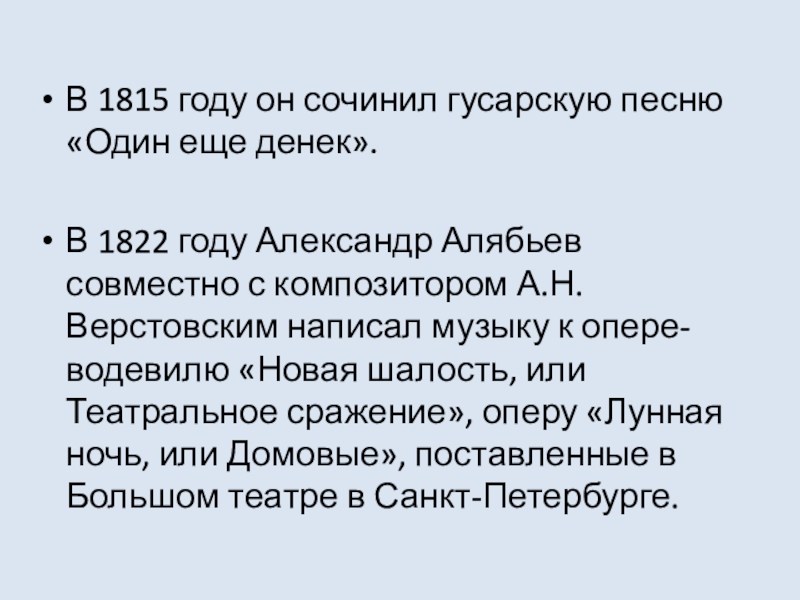 году Александр Алябьев совместно с композитором А.Н.Верстовским написал музыку к опере-водевилю «Новая шалость, или Театральное сражение», оперу «Лунная ночь, или Домовые», поставленные в Большом театре в Санкт-Петербурге.
