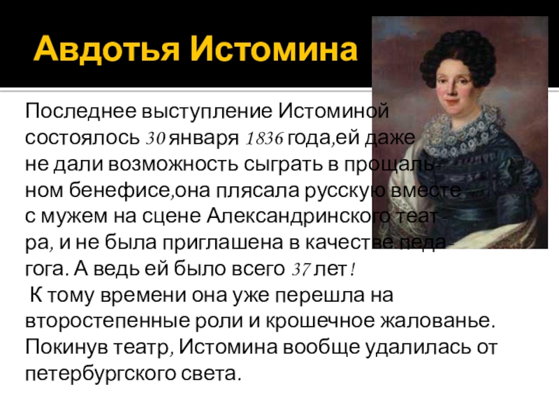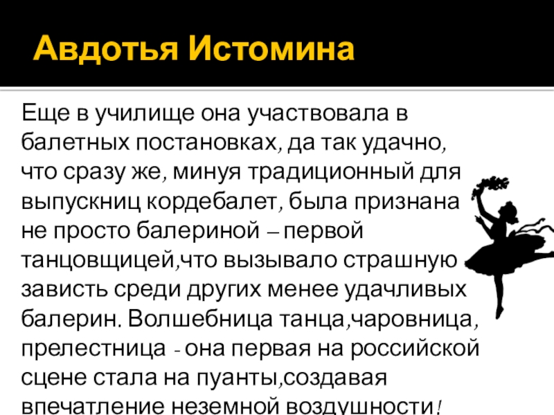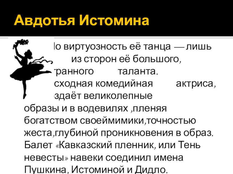 Авдотья Истомина			Но виртуозность её танца — лишь одна 		из сторон её большого, многогранного 		таланта. Превосходная комедийная 		актриса,она