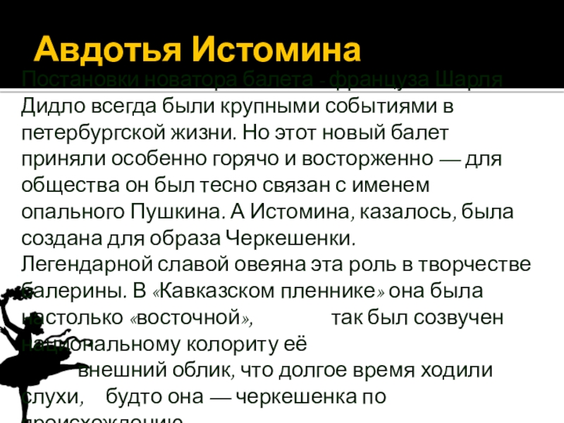 событиями в петербургской жизни. Но этот новый балет приняли особенно горячо и восторженно — для общества он был тесно связан с именем опального Пушкина. А Истомина, казалось, была создана для образа Черкешенки. Легендарной славой овеяна эта роль в творчестве балерины. В «Кавказском пленнике» она была настолько «восточной», так был созвучен национальному колориту её