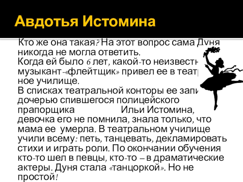 не могла ответить. Когда ей было 6 лет, какой-то неизвестный музыкант-«флейтщик» привел ее в театраль- ное училище. В списках театральной конторы ее записали дочерью спившегося полицейского прапорщика Ильи Истомина, девочка его не помнила, знала только, что мама ее  умерла. В театральном училище учили всему: петь, танцевать, декламировать стихи и играть роли. По окончании обучения кто-то шел в певцы, кто-то – в драматические актеры. Дуня стала «танцоркой». Но не простой!