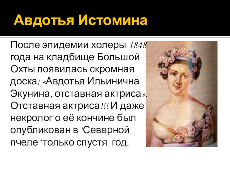 Авдотья Истомина			После эпидемии холеры 1848 года на кладбище Большой Охты появилась скромная доска: «Авдотья Ильинична Экунина, отставная