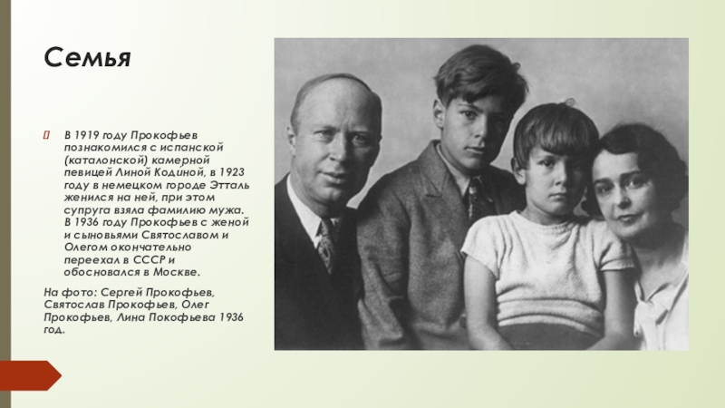 Коди́ной, в 1923 году в немецком городе Этталь женился на ней, при этом супруга взяла фамилию мужа. В 1936 году Прокофьев с женой и сыновьями Святославом и Олегом окончательно переехал в СССР и обосновался в Москве.