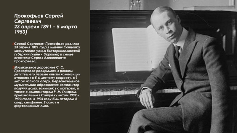 Музыкальное дарование С. С. Прокофьева раскрылось в раннем детстве, его первые опыты композиции относятся к 5-6-летнему возрасту, в 9 лет он написал оперу. Первоначальное музыкальное образование композитор получил дома, занимаясь с матерью, а также с композитором Р. М. Глиэром, приезжавшим в Сонцовку летом 1902 и 1903 годов. К 1904 году был автором 4 опер, симфонии, 2 сонат и фортепианных пьес.