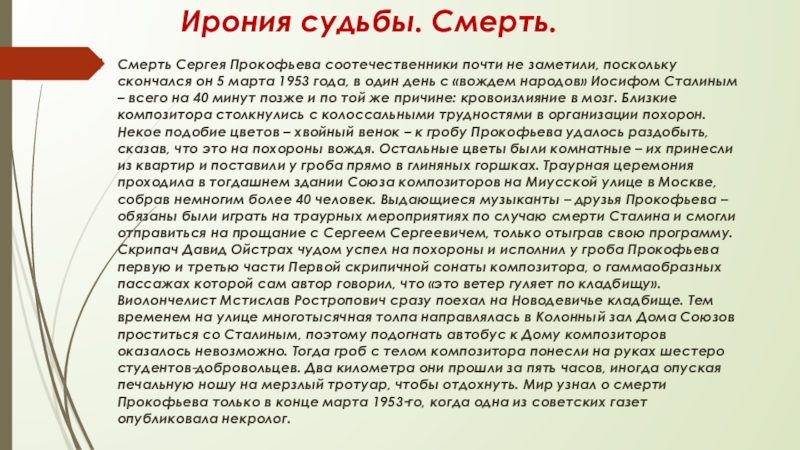 он 5 марта 1953 года, в один день с «вождем народов» Иосифом Сталиным – всего на 40 минут позже и по той же причине: кровоизлияние в мозг. Близкие композитора столкнулись с колоссальными трудностями в организации похорон. Некое подобие цветов – хвойный венок – к гробу Прокофьева удалось раздобыть, сказав, что это на похороны вождя. Остальные цветы были комнатные – их принесли из квартир и поставили у гроба прямо в глиняных горшках. Траурная церемония проходила в тогдашнем здании Союза композиторов на Миусской улице в Москве, собрав немногим более 40 человек. Выдающиеся музыканты – друзья Прокофьева – обязаны были играть на траурных мероприятиях по случаю смерти Сталина и смогли отправиться на прощание с Сергеем Сергеевичем, только отыграв свою программу. Скрипач Давид Ойстрах чудом успел на похороны и исполнил у гроба Прокофьева первую и третью части Первой скрипичной сонаты композитора, о гаммаобразных пассажах которой сам автор говорил, что «это ветер гуляет по кладбищу». Виолончелист Мстислав Ростропович сразу поехал на Новодевичье кладбище. Тем временем на улице многотысячная толпа направлялась в Колонный зал Дома Союзов проститься со Сталиным, поэтому подогнать автобус к Дому композиторов оказалось невозможно. Тогда гроб с телом композитора понесли на руках шестеро студентов‑добровольцев. Два километра они прошли за пять часов, иногда опуская печальную ношу на мерзлый тротуар, чтобы отдохнуть. Мир узнал о смерти Прокофьева только в конце марта 1953‑го, когда одна из советских газет опубликовала некролог.