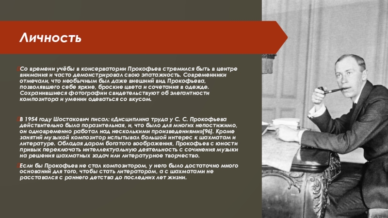 и часто демонстрировал свою эпатажность. Современники отмечали, что необычным был даже внешний вид Прокофьева, позволявшего себе яркие, броские цвета и сочетания в одежде. Сохранившиеся фотографии свидетельствуют об элегантности композитора и умении одеваться со вкусом.