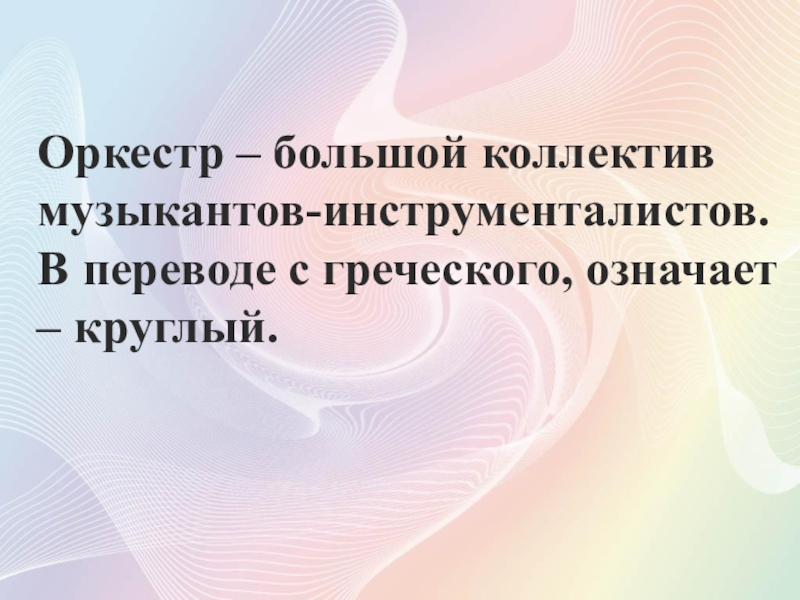 Оркестр – большой коллектив музыкантов-инструменталистов.В переводе с греческого, означает – круглый.