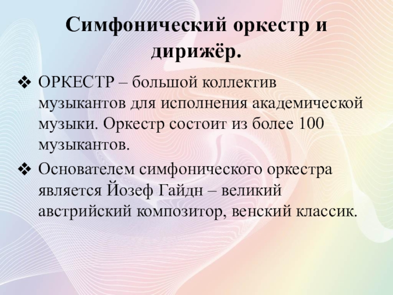 Основателем симфонического оркестра является Йозеф Гайдн – великий австрийский композитор, венский классик.