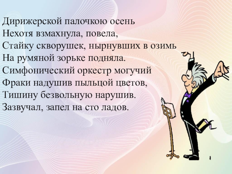 Дирижерской палочкою осеньНехотя взмахнула, повела,Стайку скворушек, нырнувших в озимьНа румяной зорьке подняла.Симфонический оркестр могучийФраки надушив пыльцой