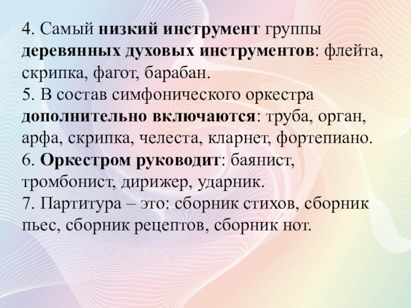 4. Самый низкий инструмент группы деревянных духовых инструментов: флейта, скрипка, фагот, барабан.5. В состав симфонического оркестра