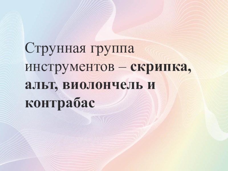 Слайд 8Струнная группа инструментов – скрипка, альт, виолончель и контрабас