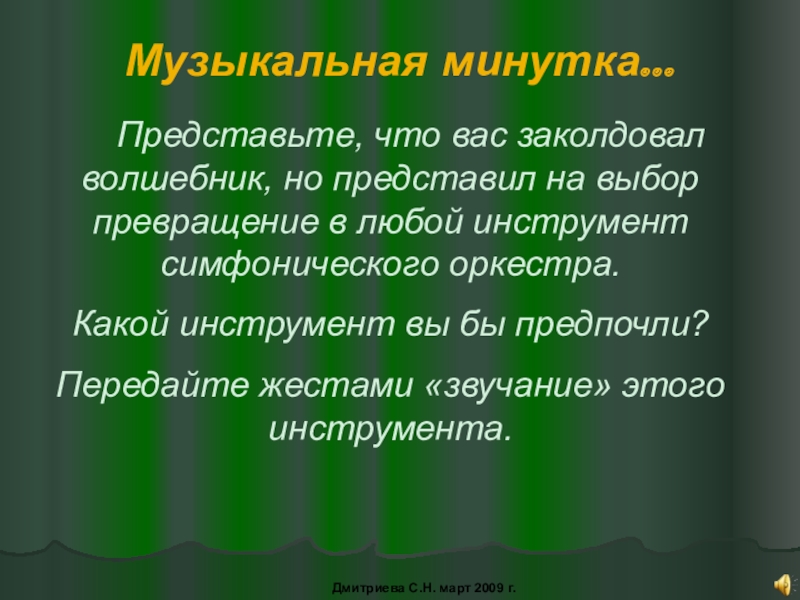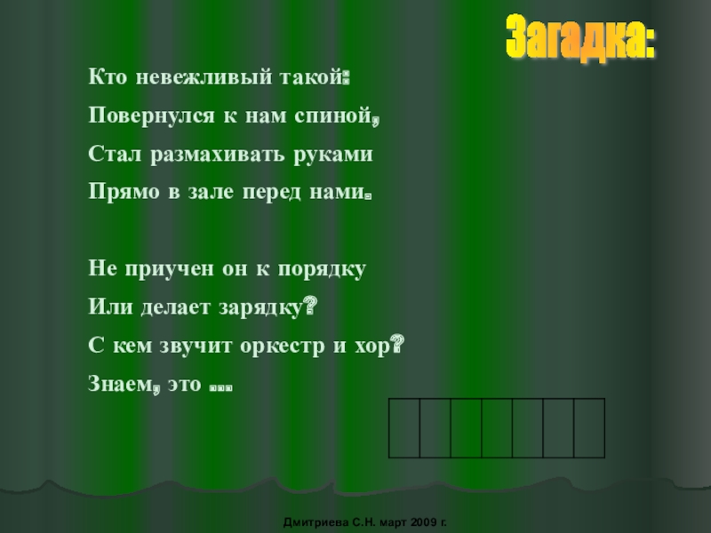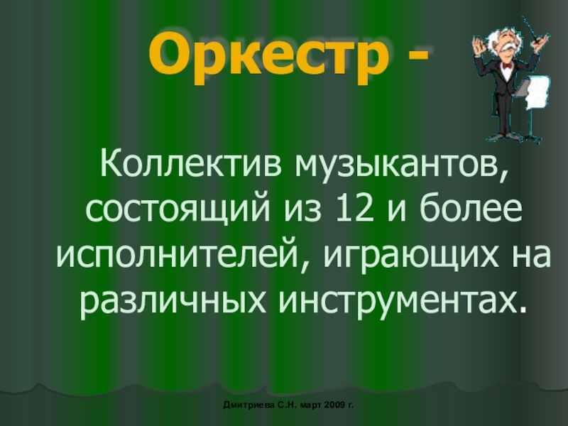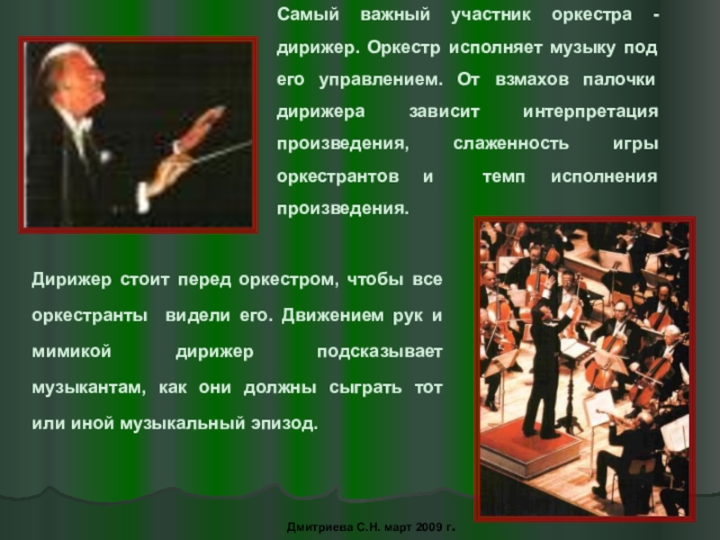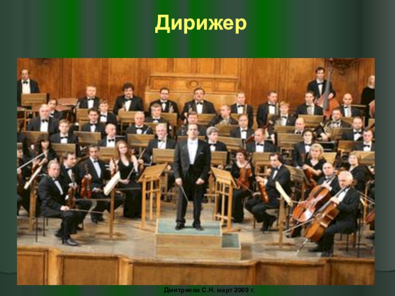 Дирижер стоит перед оркестром, чтобы все оркестранты видели его. Движением рук и мимикой дирижер подсказывает музыкантам, как они должны сыграть тот или иной музыкальный эпизод.