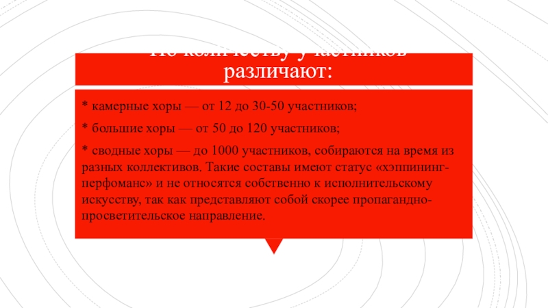 * сводные хоры — до 1000 участников, собираются на время из разных коллективов. Такие составы имеют статус «хэппининг-перфоманс» и не относятся собственно к исполнительскому искусству, так как представляют собой скорее пропагандно-просветительское направление.