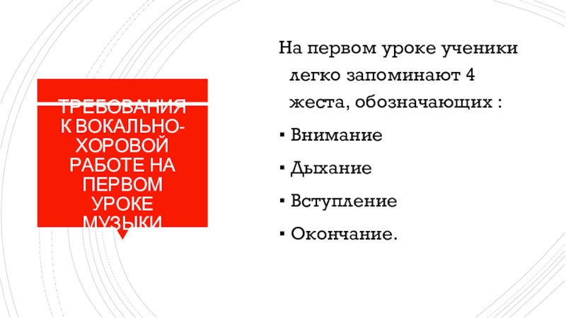 Слайд 26ТРЕБОВАНИЯ К ВОКАЛЬНО-ХОРОВОЙ РАБОТЕ НА ПЕРВОМ УРОКЕ МУЗЫКИ