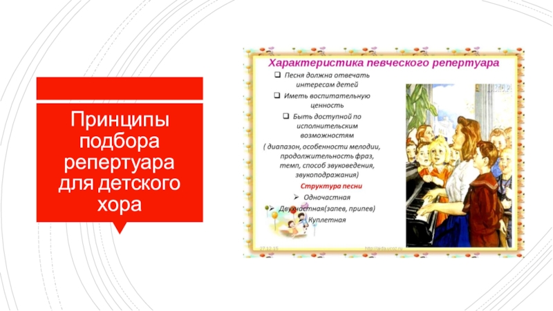 Слайд 20Принципы подбора репертуара для детского хора
