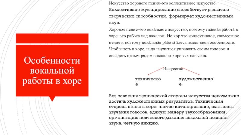 Хоровое пение–это вокальное искусство, поэтому главная работа в хоре–это работа над вокалом. Но хор это коллективное, совместное пение и поэтому вокальная работа здесь имеет свои особенности. Чтобы петь в хоре, надо научиться управлять своим голосом и овладеть целым рядом вокально-хоровых навыков.