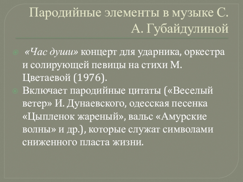 Слайд 17Пародийные элементы в музыке С. А. Губайдулиной