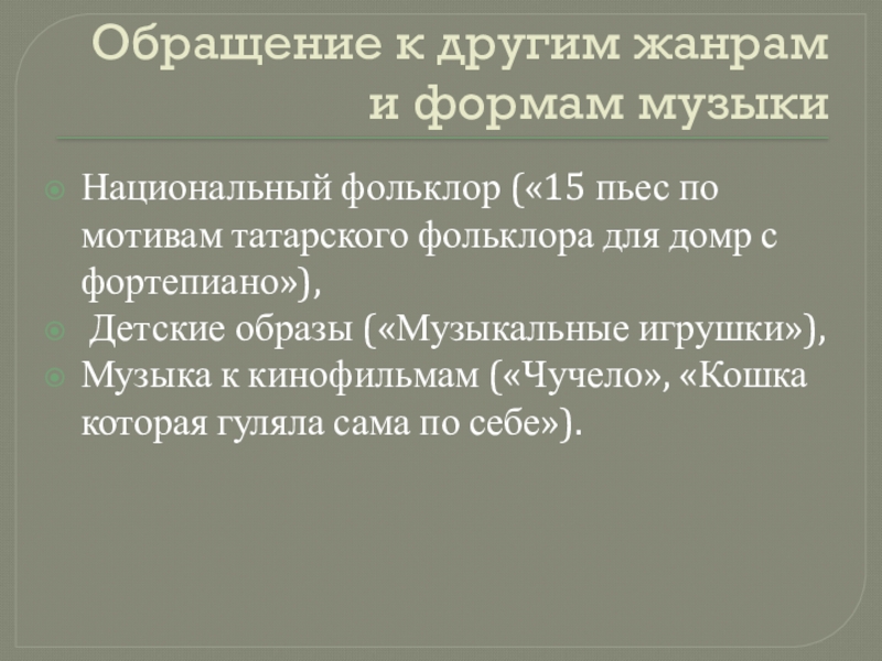 Музыка к кинофильмам («Чучело», «Кошка которая гуляла сама по себе»).