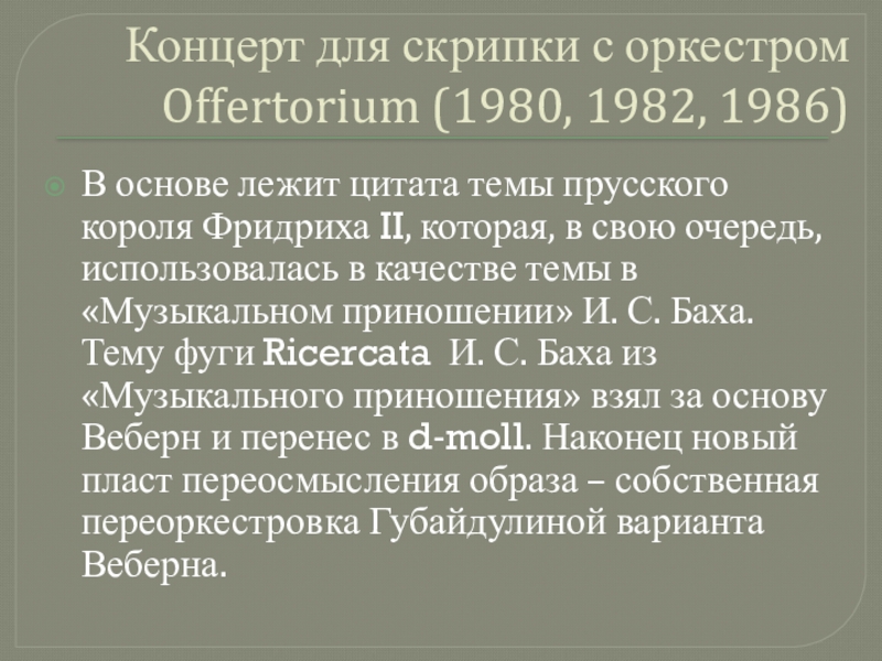 цитата темы прусского короля Фридриха II, которая, в свою очередь, использовалась в качестве темы в «Музыкальном приношении» И. С. Баха. Тему фуги Ricercata И. С. Баха из «Музыкального приношения» взял за основу Веберн и перенес в d-moll. Наконец новый пласт переосмысления образа – собственная переоркестровка Губайдулиной варианта Веберна.