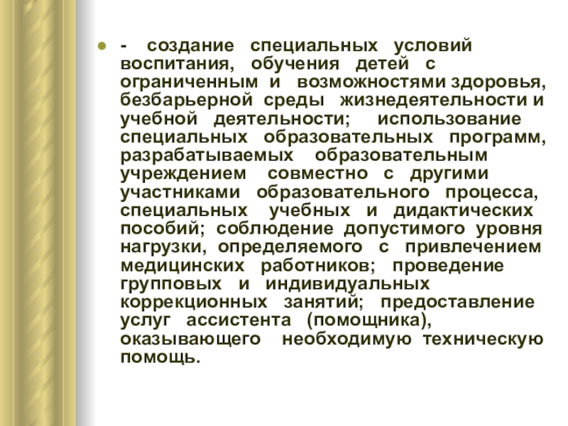 детей с ограниченным и возможностями здоровья, безбарьерной среды жизнедеятельности и учебной деятельности; использование специальных образовательных программ, разрабатываемых образовательным учреждением совместно с другими участниками образовательного процесса, специальных учебных и дидактических пособий; соблюдение допустимого уровня нагрузки, определяемого с привлечением медицинских работников; проведение групповых и индивидуальных коррекционных занятий; предоставление услуг ассистента (помощника), оказывающего необходимую техническую помощь.