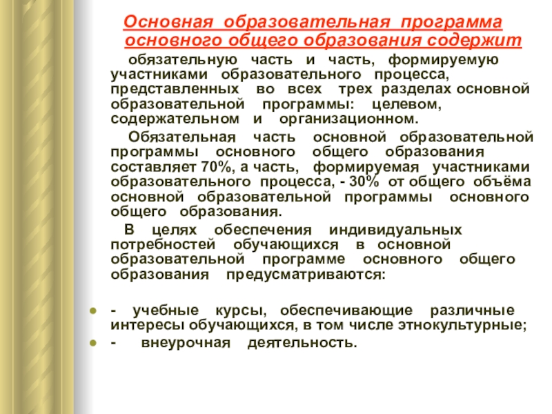 Обязательная часть основной образовательной программы основного общего образования составляет 70%, а часть, формируемая участниками образовательного процесса, - 30% от общего объёма основной образовательной программы основного общего образования.